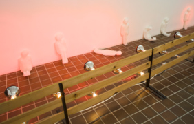 Après avoir testé les limites de son propre corps dans des séries de performances le mettant en danger, puis mis en scène des phénomènes de continuité entre sa personne et ses propres enfants, l’artiste américain Dennis Oppenheim (1938-2011) a participé à l’essor de l’installation dans les années 1970. Aging aligne contre un mur une série de silhouettes humaines en paraffine, sous les feux d’une rampe de lampes à infra-rouges. Sous l’effet de la chaleur, les silhouettes ramollissent et se déforment, parfois jusqu’à l’écroulement. Inscrite dans une recherche sur la perception du temps et la dégradation des corps, cette œuvre réalisée deux ans après la conférence de Stockholm sur l’environnement anticipe de manière glaçante les enjeux climatiques actuels et leur caractère irréversible. Ses silhouettes en liquéfaction entrent dans un dialogue intense avec les recherches de Christine Deknuydt sur la dissolution et l’évaporation de la figure humaine.