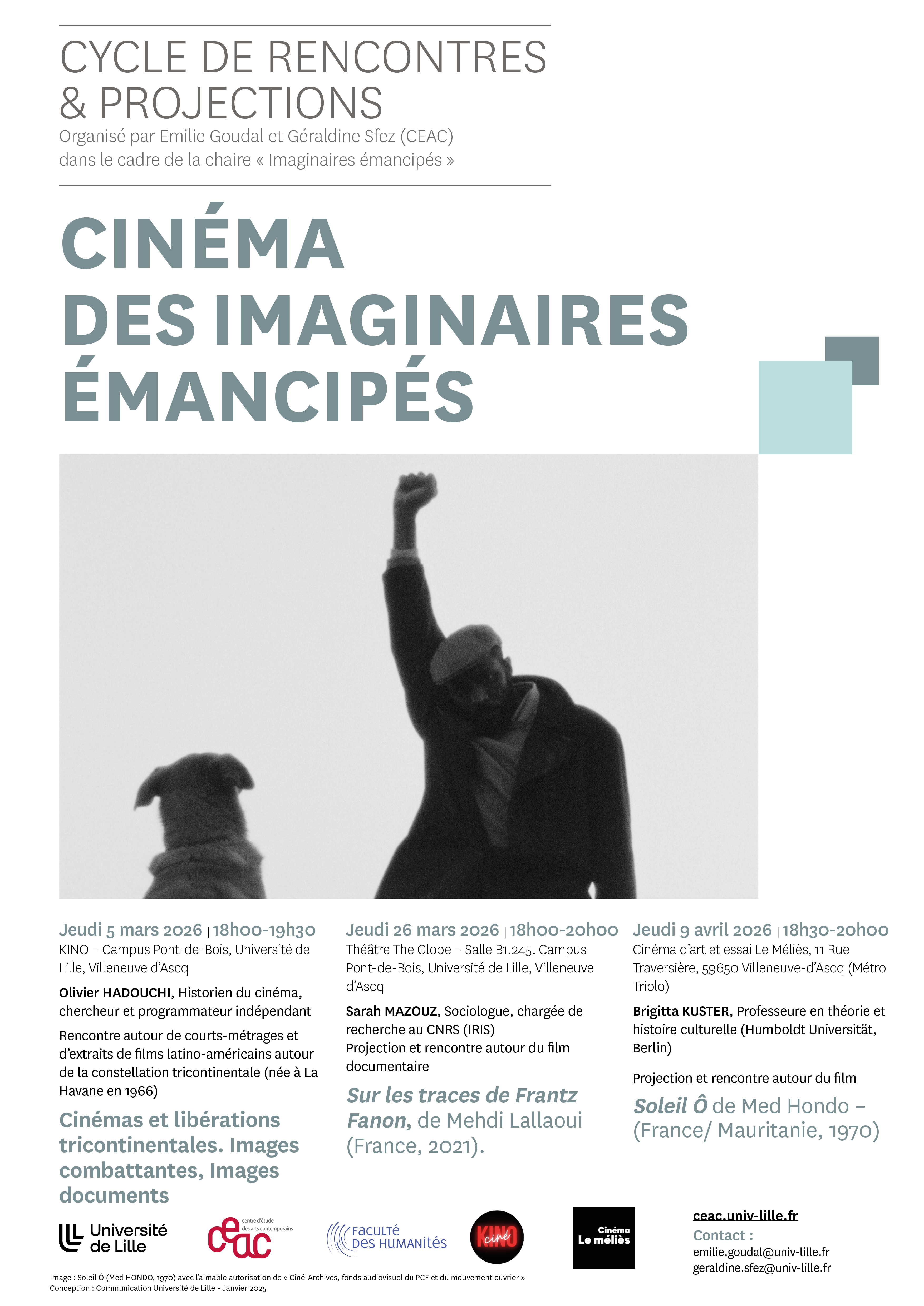 Ce cycle de rencontres, organisé dans le cadre de la Chaire « Imaginaires émancipés », propose un dialogue avec un.e chercheur.e en Sciences humaines et sociales autour d’un film sélectionné par l’intervenant.e. S’adressant à un large public, le programme présente une sélection de films rares, ancrés dans les luttes émancipatrices d’hier à aujourd’hui. De Cuba à l’Afrique diasporique, en passant par le dialogue avec l’héritage critique de Frantz Fanon, ces rencontres mobilisent l’image et la recherche pour réfléchir collectivement aux résonances et dynamiques des enjeux d’émancipation qui interrogent notre présent.