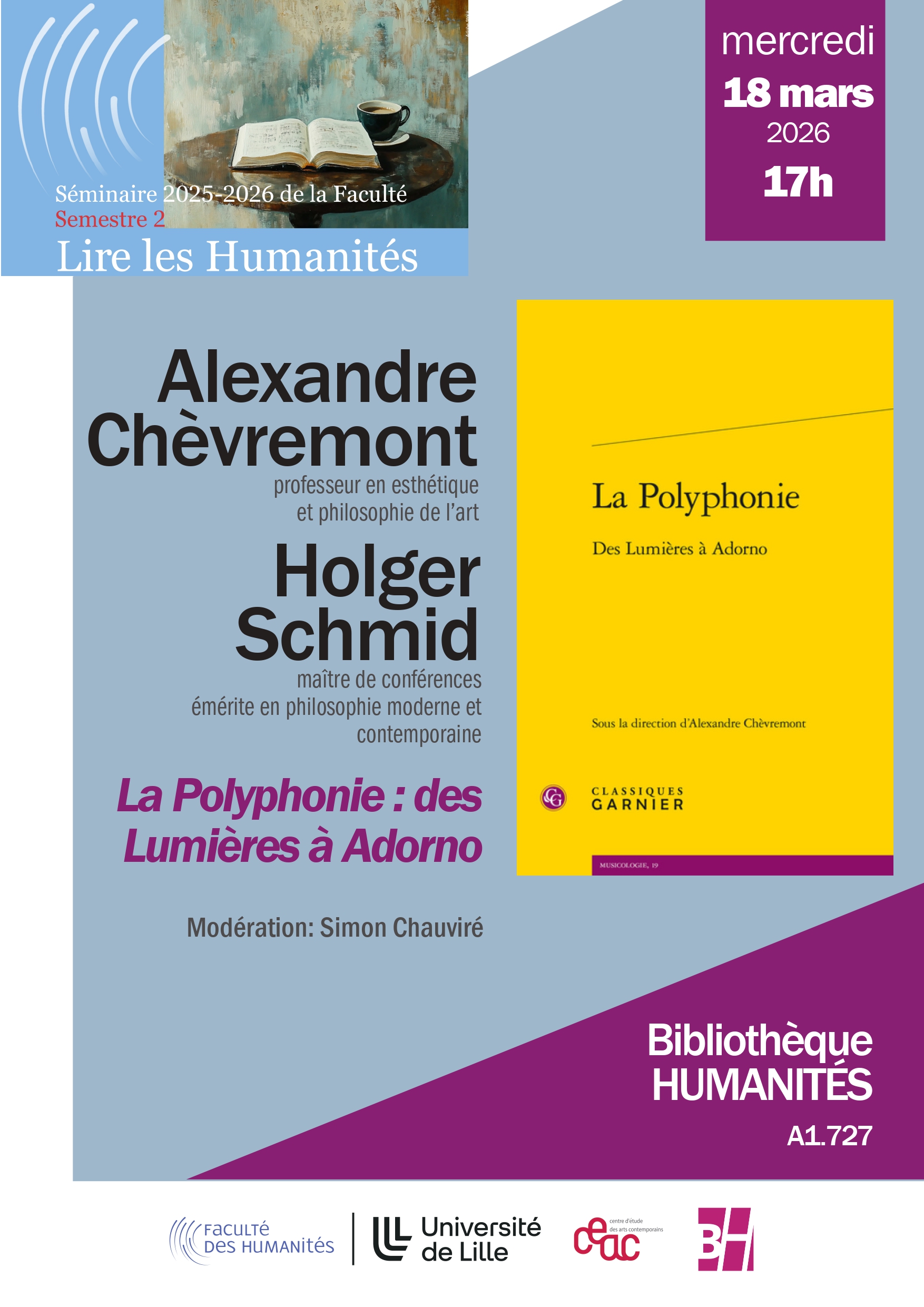 CEAC SéminaireDans le cadre du séminaire de la faculté, l'ouvrage collectif La Polyphonie, des Lumières à Adorno, sera présenté à la Bibliothèque des Humanités le 18 mars prochain à 17h.