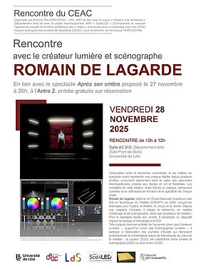 Romain de Lagarde, diplômé de l'École Nationale Supérieure des Arts et Techniques du Théâtre (ENSATT) en 2009, conçoit les éclairages pour l'opéra, le théâtre, le cirque et la danse. Depuis une vingtaine d'années, il intègre la recherche, en matière d'éclairage et de scénographie, dans ses processus de création.