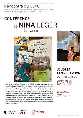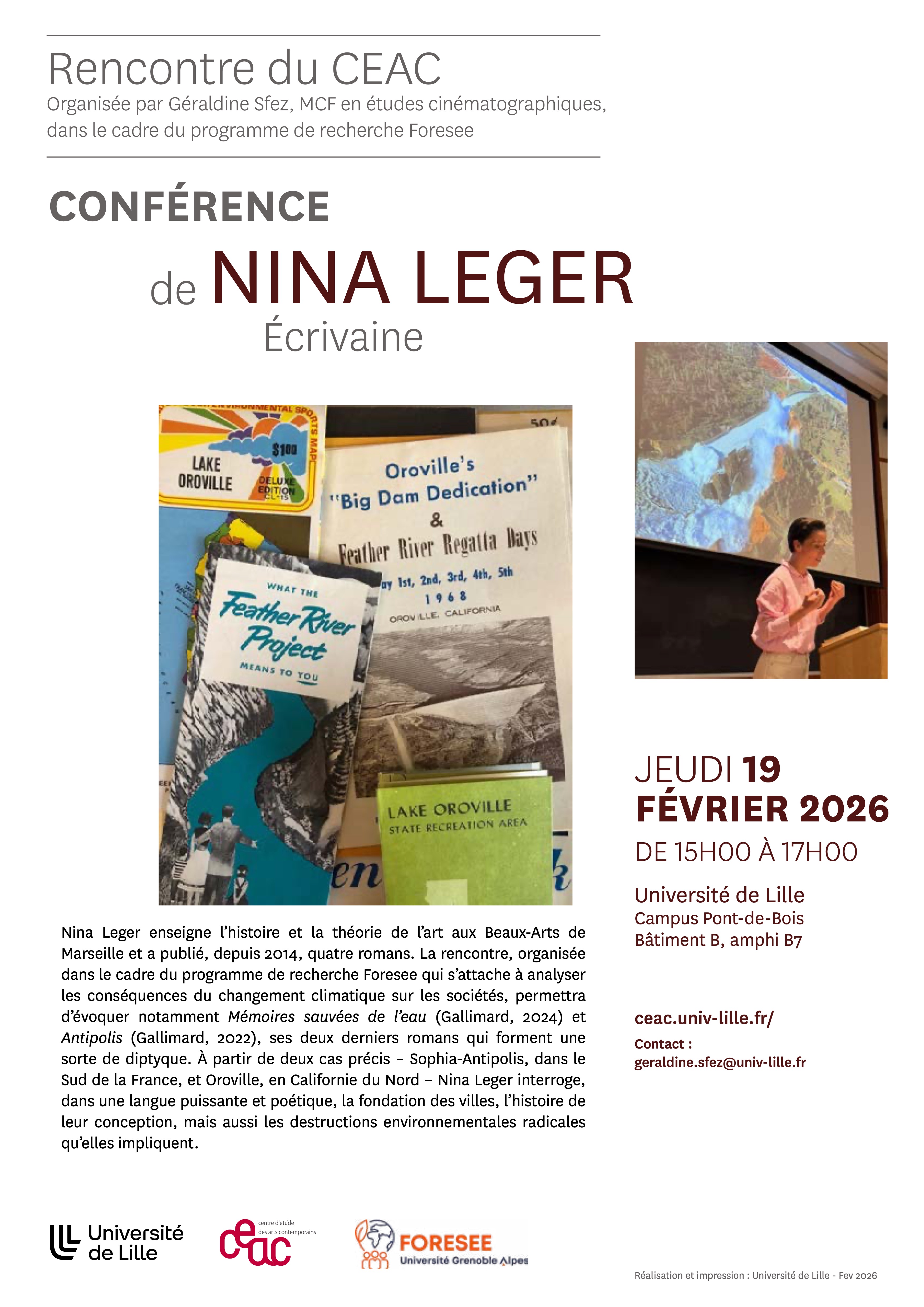 Nina Leger enseigne l’histoire et la théorie de l’art aux Beaux-Arts de Marseille et a publié, depuis 2014, quatre romans. La rencontre, organisée dans le cadre du programme de recherche Foresee qui s’attache à analyser les conséquences du changement climatique sur les sociétés, permettra d’évoquer notamment Mémoires sauvées de l’eau (Gallimard, 2024) et Antipolis (Gallimard, 2022), ses derniers romans qui forment une sorte de diptyque. À partir de deux cas précis – Sophia-Antipolis, dans le Sud de la France, et Oroville, en Californie du Nord – Nina Leger interroge, dans une langue puissante et poétique, la fondation des villes, l’histoire de leur conception, mais aussi les destructions environnementales radicales qu’elles impliquent.
