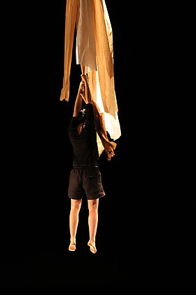 Inbal Ben Haim suspendue à un agrès de papier, photo de répétition du spectacle Pli, créé en 2021 Photographie numérique prise par la chercheuse Lucie Bonnet le 17 décembre 2020 au Centre Chorégraphique National de Grenoble